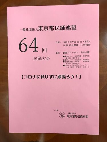 来たる9月23日(木祝)は、一般社団法人 東京都民踊連盟主催の第64回民踊大会が銀座ブロッサム 中央会館で開催されます。 「コロナに負けずに頑張ろう!」をスローガンに掲げ、感染症対策を徹底して行い11団体が39曲を踊ります。所属している江東区…