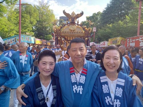 8月17日に行われた二ノ宮神輿渡御、朝6時から発輿祭が執り行われ、宮出し~7年ぶりの二ノ宮渡御が始まりました富岡八幡宮神輿総代連合会の山形会長と大久保区長とスリーショット 二部会~六部会~三部会~四部会~五部会~七部会と二ノ宮神輿が担ぎ繋が…