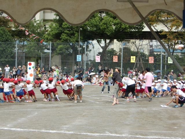 お兄さん・お姉さんクラスの力強い綱引きに声援をおくって